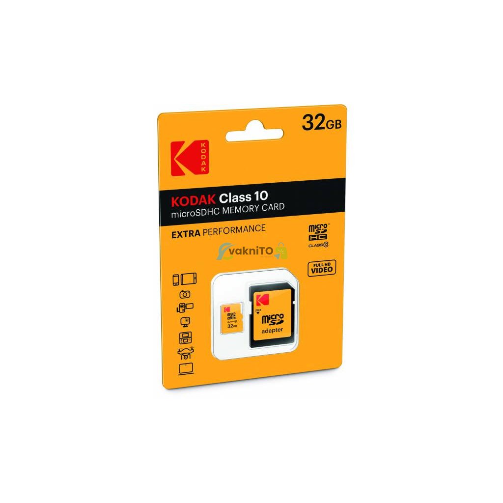 Pamäťová karta značky Kodak typu micro SDHC class 10 ponúka kapacitu 32 GB.