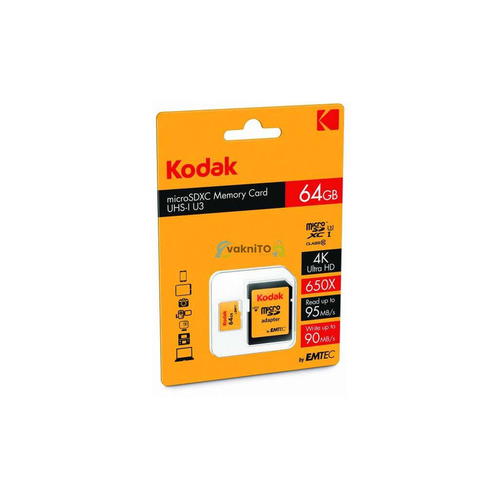 Pamäťová karta Kodak umožňuje vychutnávať si filmovanie v 4K Ultra HD a Full HD, vysokorýchlostné nahrávanie prvotriednych súborov s vysokým rozlíšením, navyše ponúka i zvýšienie kapacity smartfónu alebo tabletu a umožní ukladať multimediálne súbory bez toho, aby ste sa museli starať o nedostatok úložného priestoru