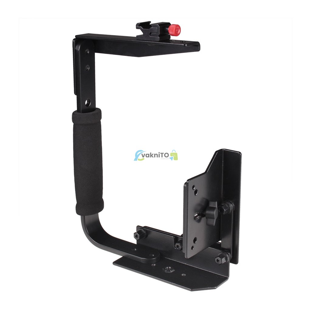 Konzola je pripevnená k fotoaparátu pomocou statívového závitu a okrem toho je vybavená skrutkou, ktorá umožňuje rýchle a spoľahlivé dotiahnutie celku. Horná časť ramena je pohyblivá, čo umožňuje nastaviť blesk podľa vašich potrieb.
